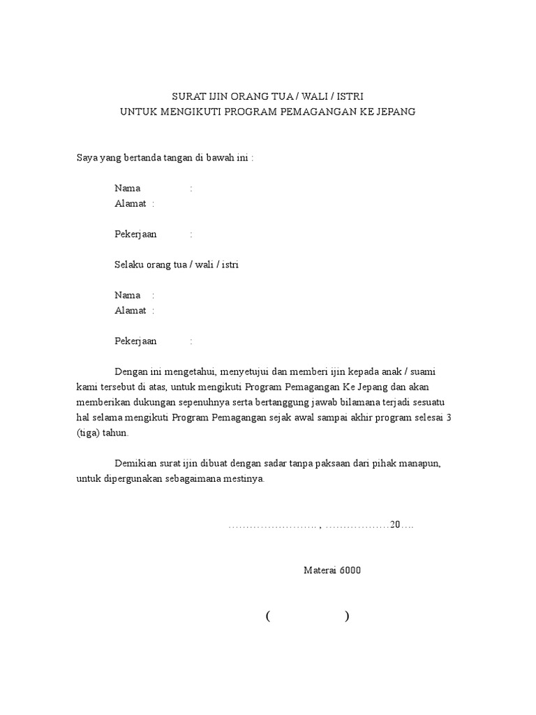 This file surat ijin orang tua.docx is hosted at free file sharing service 4shared. Surat ijin orang tua/suami/istri adalah surat yang digunakan/dikeluarkan untuk melengkapi persyaratan melamar pekerjaan baik di dalam negeri maupun di luar negeri, surat ijin orang tua apabila yang bersangkutan belum berkeluarga. Contoh surat izin orang tua. Demikianlah surat ini kami buat. Sehubungan dengan hal tersebut di atas, maka dengan ini kami mohon ijin untuk melaksanakan kegiata tersebut.